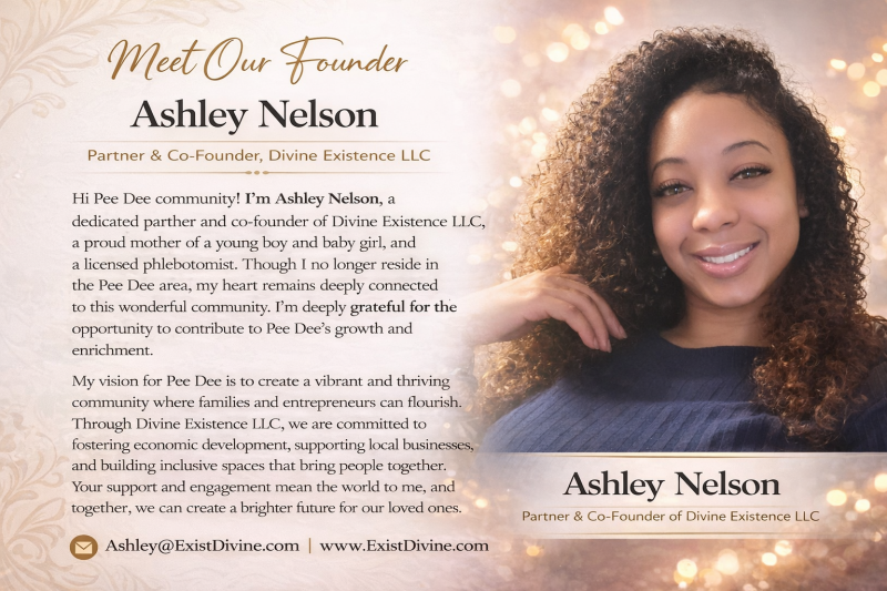 Divine Existence, LLC is based in Marion, South Carolina, with a focus on healthier choices, positive relationships, and mutual support. We intend to organize a wide range of community events including gun violence awareness, neighborhood gatherings, themed events, fundraisers, physical & mental health awareness, and job & networking events.